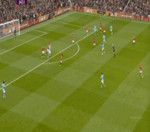 对阵曼城的第一个进球,当然是来自本方半场防下的任意球,但你要注意看到的是,在布鲁诺带球快速向前的路上,多尔古、姆贝乌莫和阿玛德-迪亚洛全部都在冲刺: